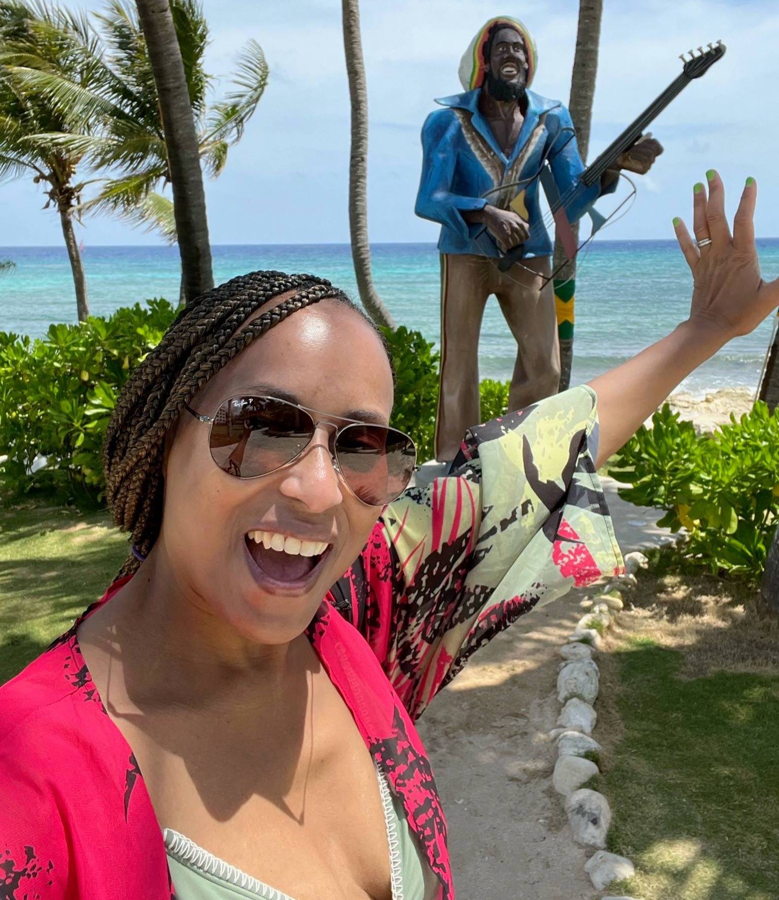Me with "Bob Marley" in Jamaica. The Hyatt properties in Montego Bay are currently closed but many resorts are open and welcoming back visitors to Jamaica! Try and support local businesses as well!
